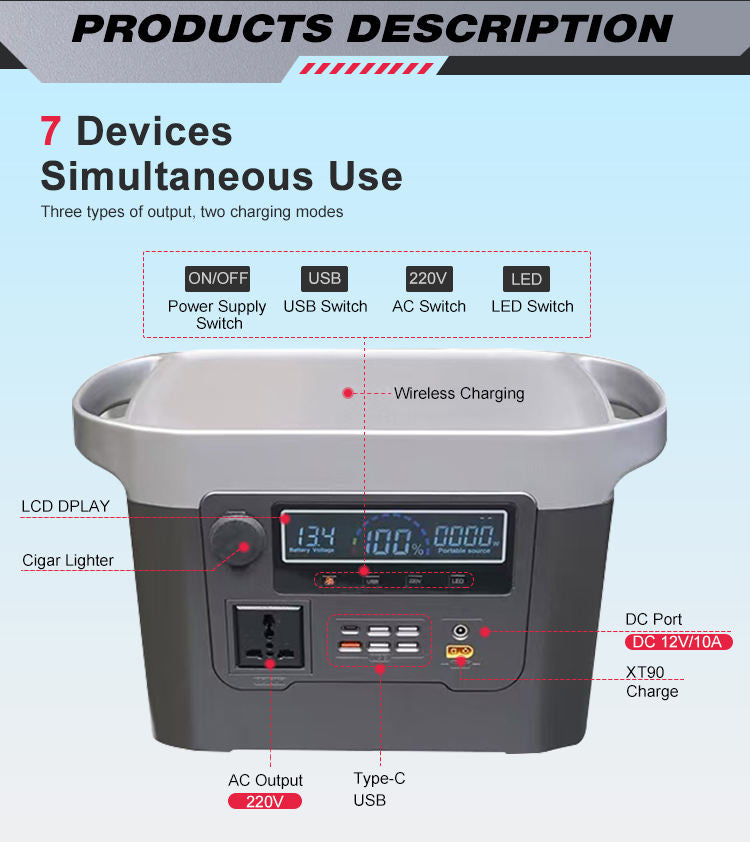 Compact 600W portable solar power station with LiFePO4 battery technology, delivering reliable AC and DC output for household energy storage and emergency backup. CE and RoHS certified for safety and environmental compliance. Ideal for camping, outdoor adventures, and off-grid living. Features multiple charging ports to power essential devices and appliances. Durable construction ensures long-term performance in various conditions. Perfect for families seeking sustainable energy independence and peace of mind during power outages.